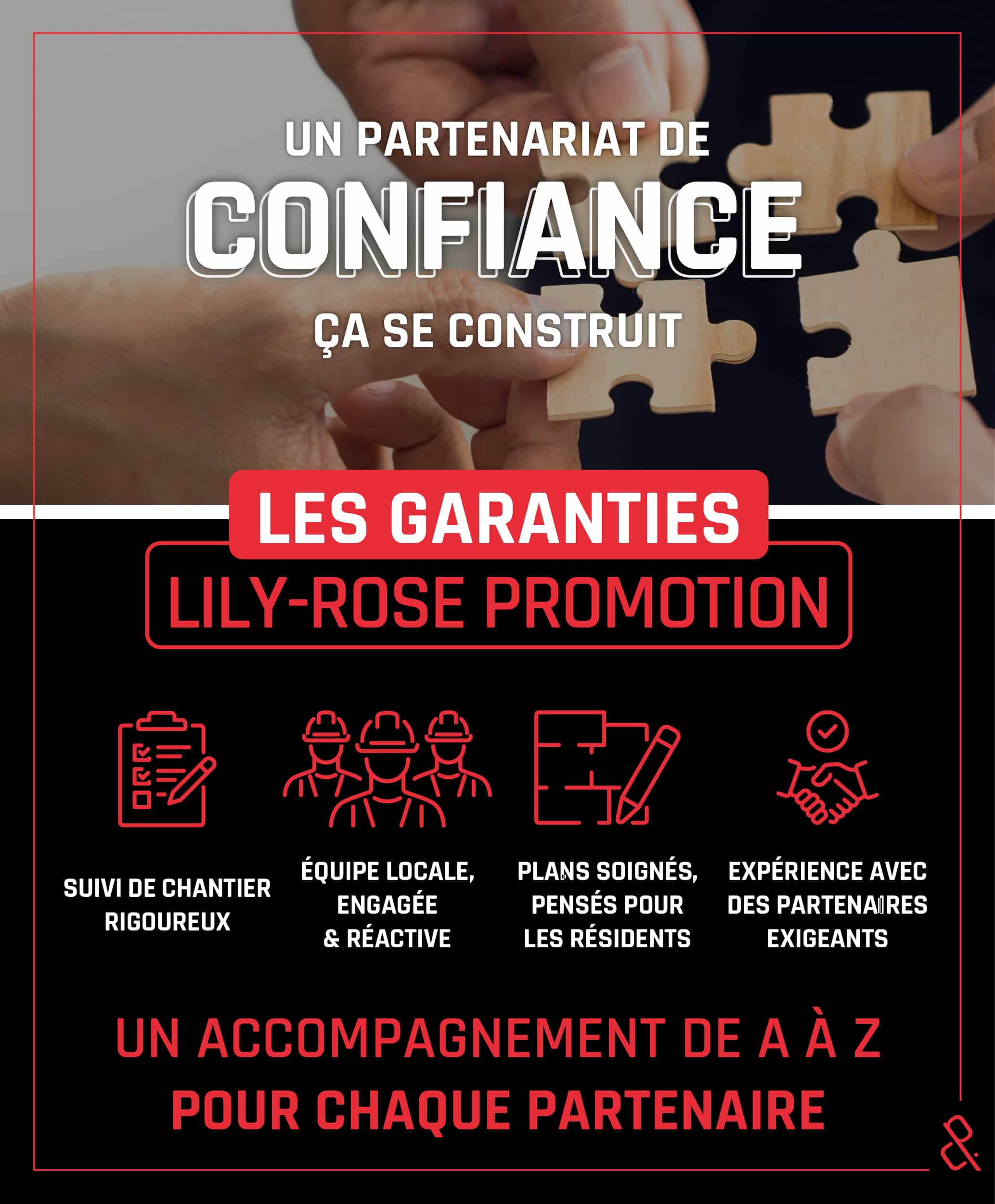 CConsciente des enjeux du territoire, des particularités locales, du marché, de ses attentes dans le plus grand respect de l’environnement, LILY-ROSE Promotion se reconnaît par des emplacements de choix pour des programmes immobiliers aux qualités affirmées et reconnues. Elle est singulière par son appréhension du bien-être et de l’insolence : des emplacements privilégiés pour un confort de vie premium, un sens de l’écoute et des aptitudes à collaborer en intelligence avec l’ensemble des acteurs du marché : les collectivités publiques, les iinvestisseurs, les professionnels de la construction et bien évidemment les futurs acquéreurs. LILY-ROSE Promotion, c’est un regard différent sur la promotion immobilière. Elle se cultive par son jardin de partenaires, les meilleurs…